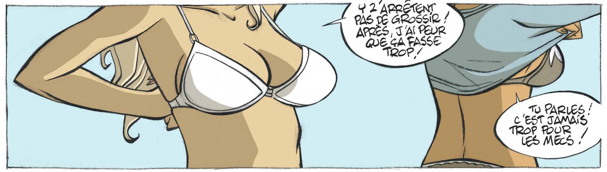Dans la bande dessinée comme dans la littérature ou le cinéma, il existe beaucoup d’histoires de fesses. Les histoires de seins sont, elles, beaucoup plus rares. D’où l’intérêt de l’album « DesSeins » d’Olivier Pont, qui rassemble sept nouvelles sur le thème des seins, toutes racontées avec beaucoup de délicatesse et de sensibilité. Sept portraits de femmes « qui refusent qu’on les réduise, qu’on les juge, qu’on les enferme », comme le souligne le quatrième de couverture du livre. Chaque récit constitue une tranche de vie différente, avec des dénouements parfois heureux et parfois tragiques. Il y a tout d’abord Chloé, une jeune femme qui, précisément, n’a presque pas de seins. Du coup, elle est complexée de devoir se mettre en maillot à la piscine, à côté de filles à la poitrine plus généreusement fournie, ce qui les aide évidemment à attirer l’attention des garçons. Puis, il y a Mathilde. En mai 1968, cette mère de famille bourgeoise n’hésite pas à quitter son mari et ses enfants pour se libérer enfin de la pression de son milieu social… mais aussi de son soutien-gorge! Il y a Alison aussi. Devenue une star de cinéma grâce à des films érotiques, cette actrice veut désormais tourner la page et se faire connaître autrement que par son corps. Plus question donc de montrer ses seins sur grand écran. Le hic, c’est que les réalisateurs et producteurs ne l’entendent pas de cette oreille… Il y a Sylvia, une femme au physique plantureux. Avant, son mari aimait ses formes rondes, mais il s’en est lassé. Aujourd’hui, il la trompe avec une femme plus jeune et plus mince. Plutôt que de fermer les yeux, Sylvia va utiliser ses seins pour concocter une vengeance diablement efficace. Il y a Fanny, dont l’histoire est l’une des plus touchantes de l’album. Juste avant de subir une mastectomie, elle décide de poser nue comme modèle, afin de garder une trace dessinée de son corps d’avant l’opération. Il y a Elikya, une jeune femme africaine qui refuse qu’on la marie de force et qui finira par servir de modèle pour une statuette rituelle capable de faire tomber la pluie. Et enfin, il y a Fleur, dont la boutique de dessous féminins renferme bien des secrets.