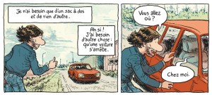 Depuis quelques semaines, le ramdam autour des élections présidentielles françaises occupe tout l’espace médiatique et donne l’image d’une France divisée et en crise. Du coup, cela fait un bien fou de prendre un peu de distance par rapport à cette actualité peu réjouissante. Dans « La France sur le pouce », une BD quasiment sociologique, Olivier Courtois et Phicil jettent un regard nouveau et rafraichissant sur l’Hexagone. Et prouvent, si jamais c’était encore nécessaire, qu’on peut aujourd’hui aborder tous les sujets par le biais de la bande dessinée. Un peu comme le film « Into the Wild », le récit autobiographique couché sur papier par Olivier Courtois raconte le parcours d’un homme qui abandonne la sédentarité et le confort matériel pour renouer avec un mode de vie plus authentique. Mais l’ex-journaliste le fait de manière beaucoup plus soft que Christopher dans « Into the Wild ». Son objectif n’est pas de se couper du monde, mais au contraire d’aller à la rencontre des autres. C’est surtout cet aspect-là qui est mis en avant dans le livre. On sent clairement qu’Olivier Courtois se lance sur les routes de France avec un état d’esprit résolument positif. Dans son scénario, il ne s’attarde d’ailleurs pas trop sur les aspects plus compliqués de son périple en auto-stop, même si on imagine que ça n’a pas du être simple pour lui de passer autant de nuits froides et humides à la belle étoile. Ce qui est très réussi dans « La France sur le pouce », c’est son découpage. L’histoire est racontée par petits chapitres, qui correspondent chacun à une région ou à une ville. Cette variété de paysages et de rencontres donnent du rythme au périple d’Olivier et empêchent le lecteur de s’ennuyer, tandis que le suspense augmente au fur et à mesure que l’auto-stoppeur revient petit à petit vers Lyon: que va-t-il faire une fois qu’il sera de retour à son point de départ? Mention spéciale au dessinateur Phicil, dont le coup de crayon à la fois simple et précis donne vie de manière très crédible à ce tour de France à la force du pouce. Un album original et surprenant… qui donnerait presque envie de tout plaquer pour se lancer à l’aventure!