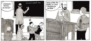 Sorj Chalandon: Je pense qu’il est important de souligner que ce que Sébastien garde de mon texte, ce sont les dialogues. Toute la narration, tout ce qui se passe dans la tête du petit Emile, s’efface au profit du dessin et des dialogues.