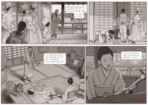 A quoi ressemblait la vie quotidienne d’une geisha dans le Japon encore très traditionnel du début du XXème siècle? Le scénariste Christian Perrissin et le dessinateur Christian Durieux le révèlent avec beaucoup de talent dans « Geisha ou le jeu du shamisen », un diptyque fascinant dont la deuxième partie vient de paraître chez Futuropolis. Dans le premier épisode, on avait découvert comment la famille de la petite Setsuko Tsuda avait dû quitter son village d’origine pour échapper à la misère. Hélas, l’arrivée en ville n’avait pas vraiment amélioré leur sort. Au contraire, la situation avait été de mal en pis lorsque le père de Setsuko, un ancien samouraï, avait été fauché par un tramway. Amputé d’une de ses jambes, le fier guerrier devenu un pitoyable alcoolique avait perdu tout espoir de trouver un travail et nourrir sa famille. La mort dans l’âme, il s’était donc résigné à « vendre » sa fille Setsuko à une « okiya », autrement dit une maison de geishas, dans l’espoir que celle-ci puisse lui offrir une vie meilleure. Dans le deuxième épisode, on retrouve la jeune fille quelques années plus tard. Désormais agée de 18 ans, Setsuko n’a plus son allure d’enfant sauvage. Après plusieurs années d’un apprentissage souvent très sévère, elle est sur le point de devenir à son tour une vraie geisha, capable de chanter, danser et marcher avec élégance, et de sourire en toutes circonstances. Mais surtout, la jeune femme peut compter sur un formidable atout: elle joue à merveille du shamisen, cet instrument traditionnel à trois cordes qui accompagne le chant des geishas. Grâce à ses sonorités envoûtantes, Setsuko parvient à faire oublier son visage un peu disgracieux pour se muer en Kitsune la renarde.