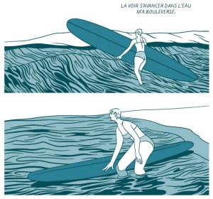 C’est bien connu: les images sont souvent plus parlantes que les mots. AJ Dungo le démontre à merveille dans « In waves », un roman (très) graphique de plus de 400 pages dans lequel cet illustrateur de talent, qui travaille aussi pour le monde de la publicité et de la presse, parvient à faire passer énormément d’émotions grâce à des dessins très simples et très justes. Alternant les séquences sépia (pour raconter l’histoire du surf) et turquoise (pour les pages consacrées à sa relation avec Kristen), « In waves » est un livre à l’ambiance très particulière, teintée de mélancolie et de romantisme un peu fleur bleue. Dungo lui-même décrit sa BD comme « un mémorial pour Kristen ». A la base, l’auteur américain avait pourtant un tout autre projet en tête, puisqu’il voulait simplement faire un livre sur les pionniers du surf. C’est l’éditeur britannique Nobrow, qui avait repéré l’énorme potentiel du jeune homme, qui lui a suggéré d’intégrer son histoire personnelle avec Kristen dans son récit et de la mêler à son histoire du surf. A priori, l’association des deux peut paraître un peu incongrue, mais au final le lien paraît évident. En raison de la passion commune d’AJ et de Kristen pour le surf, bien sûr, mais surtout, on se rend compte que la maladie de la jeune femme ressemble à ces grosses vagues que l’on doit affronter en tant que surfeur. Parfois on les maîtrise, mais à d’autres moments on est submergé par l’océan. Même si c’est un livre forcément très douloureux pour lui, AJ Dungo signe des débuts très remarqués dans le monde de la bande dessinée. La meilleure preuve, c’est que Craig Thompson (« Blankets », « Habibi »), l’un des grands noms du « graphic novel », se montre particulièrement enthousiaste. Pour lui, AJ Dungo « écrit et dessine comme un surfeur, avec fluidité, grâce et une véritable maîtrise de la respiration ». Une belle reconnaissance pour un livre qui n’a certainement pas fini de faire parler de lui.