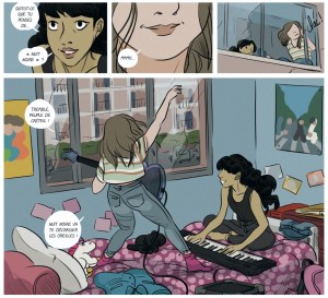 Pour chacun de mes albums, je commence toujours par préparer une playlist. Je choisis des titres qui correspondent à l’ambiance générale de la BD, mais aussi des titres qui correspondent à chaque moment en particulier. Si c’est une scène un peu triste, je vais prévoir une musique plutôt déprimante. Pour d’autres scènes, je choisis des musiques plus motivantes ou plus énergiques. C’était le cas pour chaque scène de concert dans cet album, par exemple. Pour le style de musique de mes héroïnes, j’avais imaginé un style plutôt pop rock électro, avec des groupes comme Beach House ou The Knife, ou encore la chanteuse canadienne Grimes. J’écoutais leur musique et ça me donnait des idées.