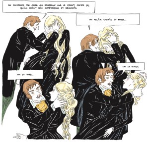 Je suis restée très fidèle à la trame de Zola, parce que c’est très facile de s’appuyer sur elle. Par contre, le roman contient beaucoup de descriptions et peu de dialogues, alors qu’en BD c’est exactement l’inverse qui est nécessaire. Du coup, ça m’a vraiment demandé une réécriture complète des dialogues. J’ai également opté pour un côté beaucoup plus vaudeville que Zola, parce qu’il faut bien avouer qu’il manque tout de même assez cruellement d’humour. Il y a plus de détachement dans mon adaptation que dans le roman.