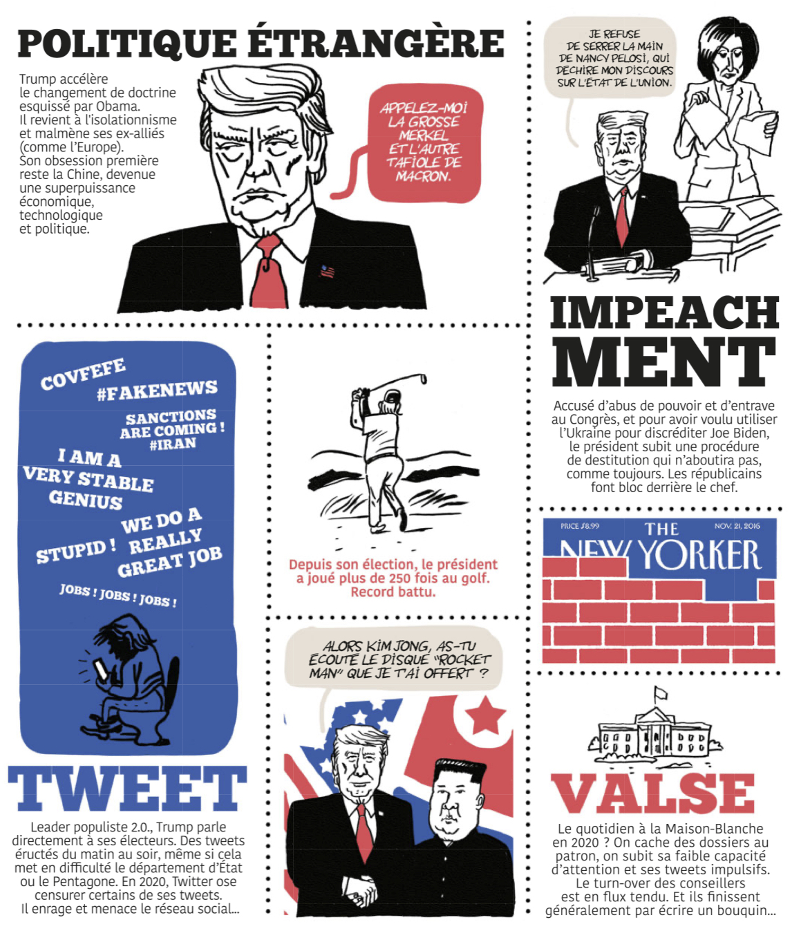 Au contraire, Trump était plutôt un repoussoir pour moi. Comme tout le monde, il m’a épuisé pendant ces quatre dernières années. Par ailleurs, je ne pense pas qu’on parle davantage du président américain depuis l’arrivée de Trump. On parlait tout autant de Barack Obama ou de George W. Bush, par exemple. En réalité, c’est depuis l’élection de Kennedy qu’on est fortement focalisés sur les présidents américains. Cela coïncide avec l’avènement de l’ère médiatique, d’abord via la télévision puis via Internet. Par contre, il est vrai qu’avec Trump, on est passés d’une information par semaine à une information par seconde autour de lui, ce qui a entraîné une surenchère jusqu’au dégoût.