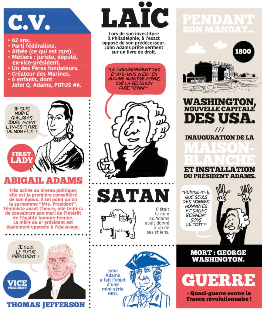 C’est de l’humour noir, mais celui qui me fait le plus rire, c’est William Henry Harrison. Quand il est élu à 68 ans, il est à la fois une légende américaine et un héros de guerre. Il est l’auteur du plus long discours d’investiture de l’Histoire américaine. Mais comme il fait un froid glacial ce jour-là à Washington, il attrape une pleurésie et il meurt un mois après. C’est quand même une histoire assez hallucinante. Dans mon livre, on découvre aussi que beaucoup de présidents étaient alcooliques, que tous les premiers présidents avaient des esclaves et que plusieurs d’entre eux ont eu des enfants avec leur maîtresse.