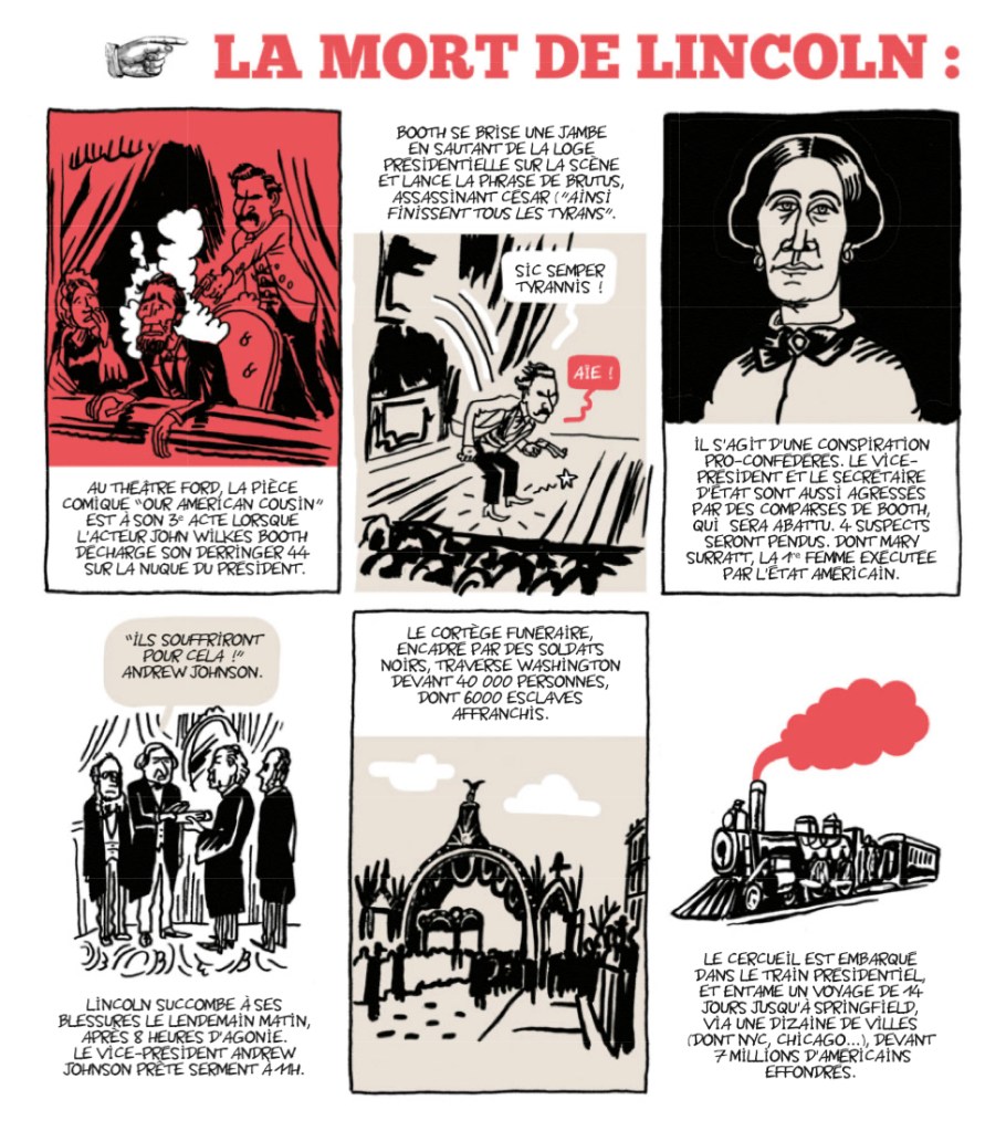 Oui, je l’ai fait pour les moments les plus mythiques. J’aurais pu ajouter aussi une séquence BD pour la guerre de Sécession, mais comme il ne s’agit pas d’un livre sur l’histoire des Etats-Unis d’Amérique mais sur celle de ses présidents, j’ai préféré me focaliser sur la mort de Lincoln.
