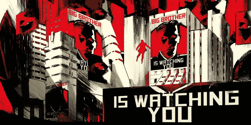 L’histoire se déroule à Londres en 1984. Mais pas le Londres qu’on connaît: la capitale britannique est remplie de buildings en béton froids et impersonnels, et se situe désormais en Océania, l’un des trois grands blocs nés suite aux guerres nucléaires qui ont ravagé le monde dans les années 1950. Les deux autres blocs sont l’Eurasia et l’Estasia, avec qui l’Océania est toujours plus ou moins en guerre, sans que l’on sache exactement pourquoi. Lorsque l’ennemi change et que l’Eurasia est remplacé par l’Estasia, ou vice versa, le Ministère de la Vérité réécrit l’Histoire pour faire en sorte que les citoyens oublient que leur allié d’aujourd’hui est en réalité leur ennemi d’hier. C’est toujours le présent qui compte, jamais le passé ou l’avenir. Winston Smith est l’un des employés de ce Ministère de la Vérité. Dans son bureau anonyme, situé dans un gigantesque bâtiment de 3.000 pièces, il est chargé de corriger les articles du passé pour faire en sorte qu’ils restent cohérents avec la ligne politique du moment et avec l’idéologie du parti. Toute l’histoire est ainsi grattée, effacée et réécrite aussi souvent que nécessaire, en supprimant soigneusement la moindre trace qui permettrait de remettre en cause la nouvelle réalité. Ce mode de fonctionnement permet au régime d’entretenir la haine de la population contre un ennemi commun, que ce soit les Eurasiens ou le traître Goldstein, car la haine crée l’union. A côté du Ministère de la Vérité, il y a trois autres grands ministères: le Ministère de la Paix est responsable de la guerre, celui de l’Abondance est en charge des affaires économiques et celui de l’Amour s’occupe du respect de la loi et de l’ordre. « La guerre c’est la paix, la liberté c’est l’esclavage, l’ignorance c’est la force », sont les trois grands slogans du parti. Winston sent bien qu’il devrait entrer en résistance, mais comme tout le monde, il est surveillé de près. Sur les murs de Londres, des grandes affiches rappellent en permanence que « Big Brother is watching you ». Les caméras de surveillance, les hélicoptères et les espions sont partout, tandis que la Police de la Pensée épie les moindres faits et gestes de chacun. Notamment grâce aux télécrans, des téléviseurs espions installés dans tous les appartements, qu’on ne peut jamais arrêter et dont on ne peut pas baisser le son. Ces écrans tapent sur le système de Winston, parce qu’ils diffusent en permanence une propagande lénifiante, où il est systématiquement question de victoires militaires et de progrès économique. Un jour, il s’installe à son bureau et commence à écrire « A bas Big Brother » dans son carnet. Immédiatement, il se rend compte qu’il vient de perpétrer le crime le plus fondamental: le crime par la pensée. « C’est un crime impossible à dissimuler. Que je détruise le carnet n’avait plus d’importance. C’était fait. Je l’avais pensé. Ils finiraient par m’attraper. » Pour ne rien arranger, il y a cette fille qui s’intéresse à lui. Qui est donc cette Julia qui le regarde de manière insistante? Et si c’était encore une espionne à la solde du parti?