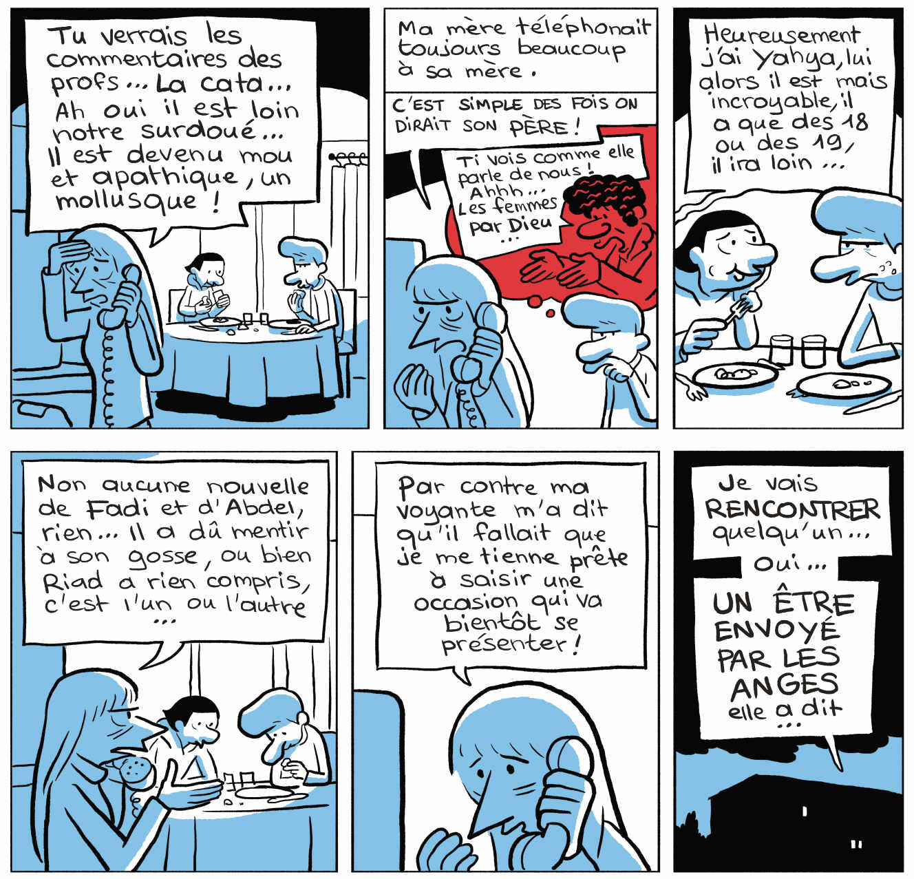 Au début de ce sixième et dernier tome de « L’Arabe du futur », Riad Sattouf a 16 ans. Nous sommes en 1994 et il vit à Rennes avec son frère Yahya et sa mère Clémentine. Celle-ci a sombré dans une profonde dépression depuis que son ex-mari est reparti en Syrie en enlevant Fadi, leur plus jeune fils. Progressivement, l’idée de faire revenir son enfant en France devient pour elle une véritable obsession. Sous l’emprise de sa voyante, elle finit même par se faire arnaquer par un avocat beau parleur, qui parvient à lui soutirer une grosse somme en lui promettant de se rendre à Damas pour soi-disant ramener son mari à la raison. Elle écrit également plusieurs lettres au président Chirac en lui demandant d’intervenir auprès du président syrien Hafez el-Assad. Mais à son plus grand désespoir, toutes ses démarches restent parfaitement vaines. De son côté, Riad ne vit pas non plus la meilleure période de sa vie. Non seulement ses bulletins scolaires sont catastrophiques, mais en plus il est persuadé que tout le monde le déteste, il est traumatisé à l’idée de devoir faire son service militaire et les filles de sa classe ne s’intéressent absolument pas à lui en raison de son physique ingrat. Il y a bien cette fille moche qui le drague, mais il jette ses lettres à la poubelle avant même de les ouvrir… En résumé, on peut dire que Riad est un ado mou et apathique dans toute sa splendeur, au grand dam de sa mère et ses grands-parents. Pour ne rien arranger, il a en permanence la petite voix de son père qui lui parle dans sa tête, généralement pour lui transmettre des idées négatives ou le rabaisser. Pas étonnant, dès lors, que le jeune Riad se considère à l’époque comme une sorte de « semi-psychopathe, aux yeux mi-clos de fourbe et à l’énergie psychique uniquement dévolue à la production de pensées sexuelles fantasmatiques ». Mais il y a de la lumière au bout du tunnel car désormais, son rêve est de devenir auteur de BD, même si son père trouve que ce n’est pas un vrai métier et refuse de le soutenir. Heureusement, grâce à un dessin de nymphe dans lequel il met tout son coeur, Riad parvient à convaincre son grand-père de financer ses études dans une école privée de dessin à Nantes. C’est le premier pas sur le long chemin vers la gloire… qui passera également par des années de psychothérapie.