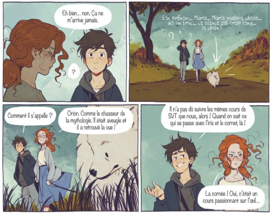 « Le cœur en braille » est ce qu’on appelle une BD feel good. L’histoire est simple et sans chichis, mais tellement pleine de générosité et de tendresse que l’on ne peut que se sentir mieux après avoir refermé le livre. Et c’est déjà un bel exploit, car provoquer un sourire n’est pas chose aisée dans notre époque de crises perpétuelles, de conflits et d’esprits chagrins. Derrière ce joli livre à la couverture attirante, dont le titre est écrit en relief, on retrouve le scénariste Joris Chamblain, connu surtout pour son best-seller « Les carnets de Cerise », et la dessinatrice Anne-lise Nalin, dont le dessin expressif et doux fait des merveilles. A deux, ils signent une version BD particulièrement convaincante du roman « Le cœur en braille » de Pascal Ruter, déjà adapté au cinéma par Michel Boujenah en 2016. Si leur adaptation de cette histoire d’une jeune fille qui séduit un garçon pour qu’il devienne ses yeux fonctionne tellement bien, c’est parce qu’elle se révèle aussi efficace et bien construite qu’une bonne série. Savamment équilibré, le récit concocté par Joris Chamblain mélange habilement les moments d’humour et d’émotion, tout en révélant petit à petit les éléments-clés du récit, sans jamais perdre le fil. Evidemment, dans la mesure où il s’agit d’une histoire d’amour entre deux ados, c’est une BD qui va parler en priorité à un public d’adolescents et de jeunes adultes. Mais pour être honnête, elle plaira sans doute à des lecteurs de tous les âges, notamment ceux qui sont en quête de belles histoires de résilience. Car malgré l’épreuve qui la frappe, la courageuse Marie-José ne baisse jamais les bras, portée par sa passion pour la musique. Et puis surtout, il y a deux grands éléments qui font de cette bande dessinée une réussite. Le premier d’entre eux, c’est le duo formé par Marie-José et Victor, qui fonctionne à merveille. Certes, on a déjà lu un nombre incalculable d’histoires dans lesquelles une fille et un garçon que tout oppose vont inévitablement finir par se rapprocher. Mais malgré tout, même si ce truc de scénariste est vieux comme le monde, on se laisse encore une fois prendre. Pourquoi? Tout simplement parce que les deux personnages principaux de cette BD sont à la fois crédibles et attachants. L’autre élément à retenir, ce sont les dessins d’Anne-lise Nalin. Ils sont à la fois tendres et modernes, tout en suscitant énormément d’émotion. Autant dire qu’on a hâte de découvrir les futurs albums de cette illustratrice de talent!