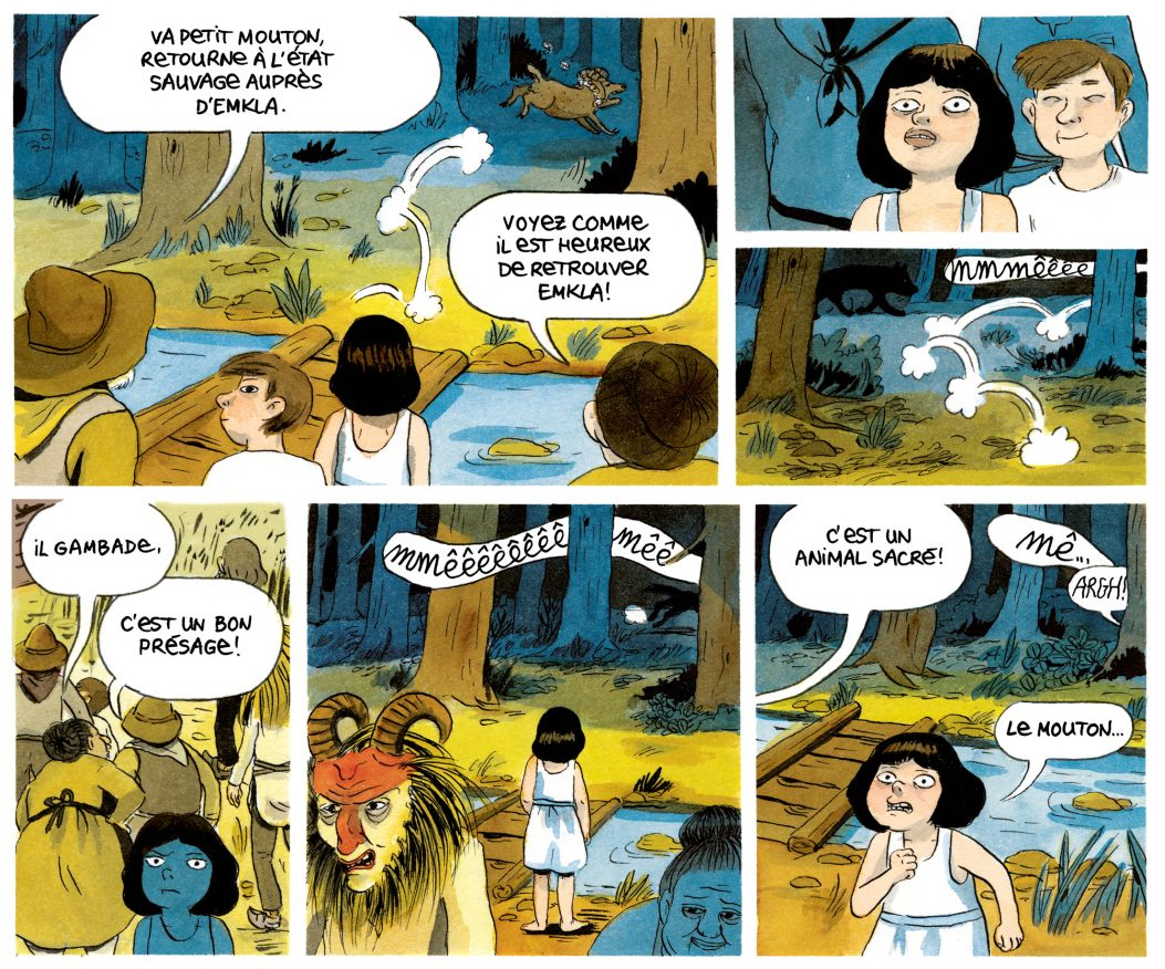 Dans un petit village de montagne situé en bordure de forêt, une jeune femme se prépare à jouer le rôle central dans la cérémonie rituelle en l’honneur d’Emkla. Coiffée d’un masque effrayant, elle prépare les poupées de laine qui accompagnent cette célébration un peu étrange, tandis que sa petite soeur s’est occupée des décorations du mouton qui s’apprête à être sacrifié. Tous les villageois sont nerveux parce qu’Emkla, une sorte d’entité surnaturelle qui se manifeste sous la forme d’une nuée d’oiseaux tourbillonnant dans le ciel, est la divinité qui les protège contre le mal. C’est sa loi qui régit leur quotidien, en leur interdisant par exemple de se rendre seuls dans la forêt ou de garder un animal sauvage chez eux. Tous ont une peur bleue de quitter le village ou de faire quoi que ce soit d’interdit, car ils sont persuadés que si la loi d’Emkla n’est pas respectée, des tas de malheurs et de fléaux vont s’abattre sur eux. « Emkla, reçois ce cadeau et préserve-nous de ta colère », invoque la jeune femme en levant les bras au ciel. Mais elle oublie d’ajouter « Et protège notre hameau de la forêt », ce qui irrite les autres villageois. Contrairement à ses congénères, elle n’est pas obnubilée par Emkla. Ce qui l’intéresse avant tout, c’est d’enfin quitter ce lieu perdu où l’on s’ennuie à mourir et de découvrir le vaste monde, au-delà de la forêt et des montagnes environnantes. Peut-être aussi que ça lui permettrait de retrouver sa mère, qui a quitté le hameau il y a des années pour ne plus jamais revenir. « Elle était de ceux d’en-bas et a toujours eu du mal à accepter la loi d’Emkla », lui répond sa tantine lorsque la jeune femme l’interroge sur sa mère. Le dieu Emkla a-t-il senti son désir de rébellion? S’est-il rendu compte que la jeune fille et sa soeur ont apprivoisé un loup sorti de la forêt toute proche? Toujours est-il que sa colère va se réveiller et que les éléments naturels vont petit à petit se déchaîner contre le hameau et ses habitants…