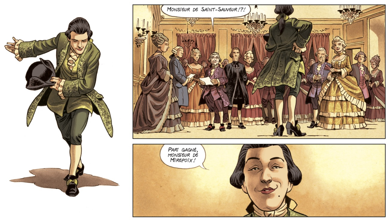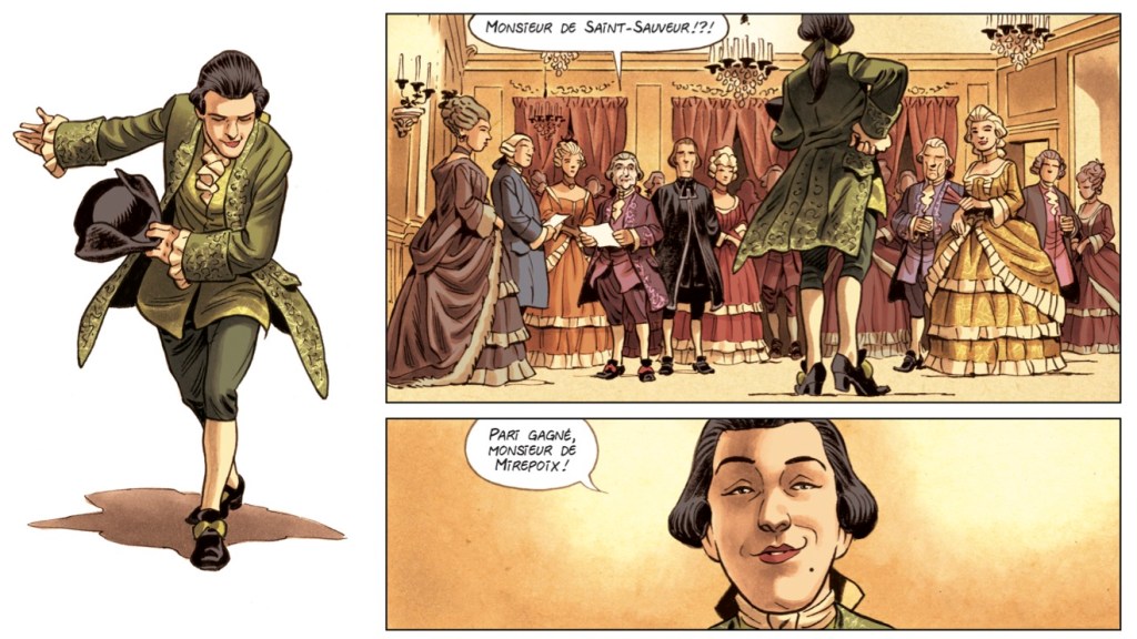 L’infâme et très peu moral chevalier Justin Fleuri de Saint-Sauveur est de ceux qui ternissent l’esprit des Lumières. Si on le sait avec certitude, c’est parce qu’on a retrouvé la correspondance du chevalier dans les tiroirs, rabats et compartiments cachés d’un secrétaire à cylindre. Ces centaines de lettres, qui s’étalent sur tout le dix-huitième siècle, dessinent « l’effarant portrait d’un malfaisant ». Un libertin fier de l’être, qui fait clairement penser au Valmont des « Liaisons dangereuses », le célèbre récit de Choderlos de Laclos. « Manipulateur, dissimulé, exempt de tout scrupule, séduisant comme le mal peut l’être, Saint-Sauveur voua sa vie à duper et corrompre, foulant au pied l’Innocence et le Bien. S’il fallait un visage au vice, c’est le sien », écrit celui qui a retrouvé sa correspondance, en précisant que la publication de ses lettres sous la forme d’une bande dessinée épistolaire participera, espérons-le, au triomphe de la vertu. Mais de quelle duperie et de quel vice parle-t-on exactement? Comme Valmont, le chevalier de Saint-Sauveur s’est lancé le défi de séduire une femme mariée, vertueuse et a priori inaccessible. Redoutable manipulateur, Saint-Sauveur, toujours accompagné par son fidèle valet Gonzague, est prêt à tout pour arriver à ses fins. Pour séduire la belle Eunice de Clairefont au nez et à la barbe de son mari, l’arrogant chevalier n’hésite pas à se faire passer pour Corentin du Préau de Vazelles, baron de la Tournerie, un homme d’esprit au-dessus de tout soupçon. Mais à force de se croire intouchable, Saint-Sauveur ne risque-t-il pas de s’enfoncer dans une inexorable descente aux enfers?