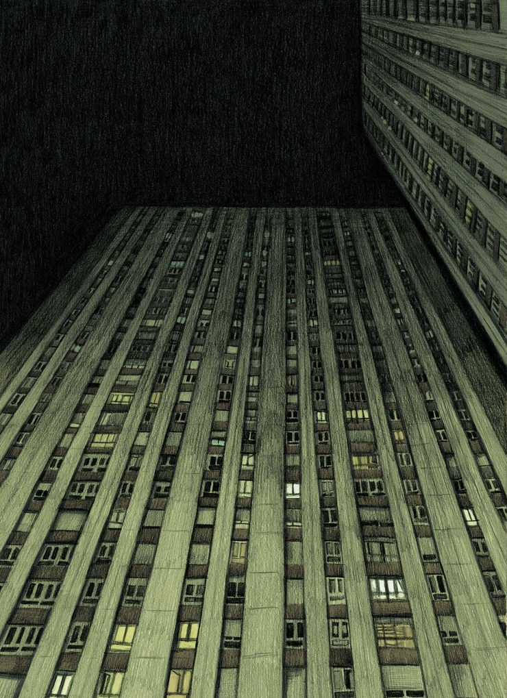 Non pas du tout. D’ailleurs, je ne l’ai pas vu. On m’en a déjà parlé à plusieurs reprises, donc il faut absolument que je le regarde. Si j’ai choisi de dessiner les Olympiades, c’est parce que j’aime beaucoup le 13ème arrondissement. Mon mari vient de là et j’y ai passé beaucoup de temps. J’aime beaucoup les tours du quartier des Olympiades. Elles te donnent l’impression de te sentir tout petit. Elle créent un vertige, une émotion. Elles ont un côté un peu oppressant. J’aime bien aussi le contraste entre ces bâtiments très hauts et les parkings souterrains. A mes yeux, ce décor particulier me permettait d’ajouter davantage de stress à mon récit. En plus, je visualise très bien l’immeuble représenté dans l’album, car je connais des gens qui y habitent. Ils ont d’ailleurs été très gentils puisqu’ils m’ont guidée dans tout l’immeuble et dans les parkings afin que je puisse me documenter.