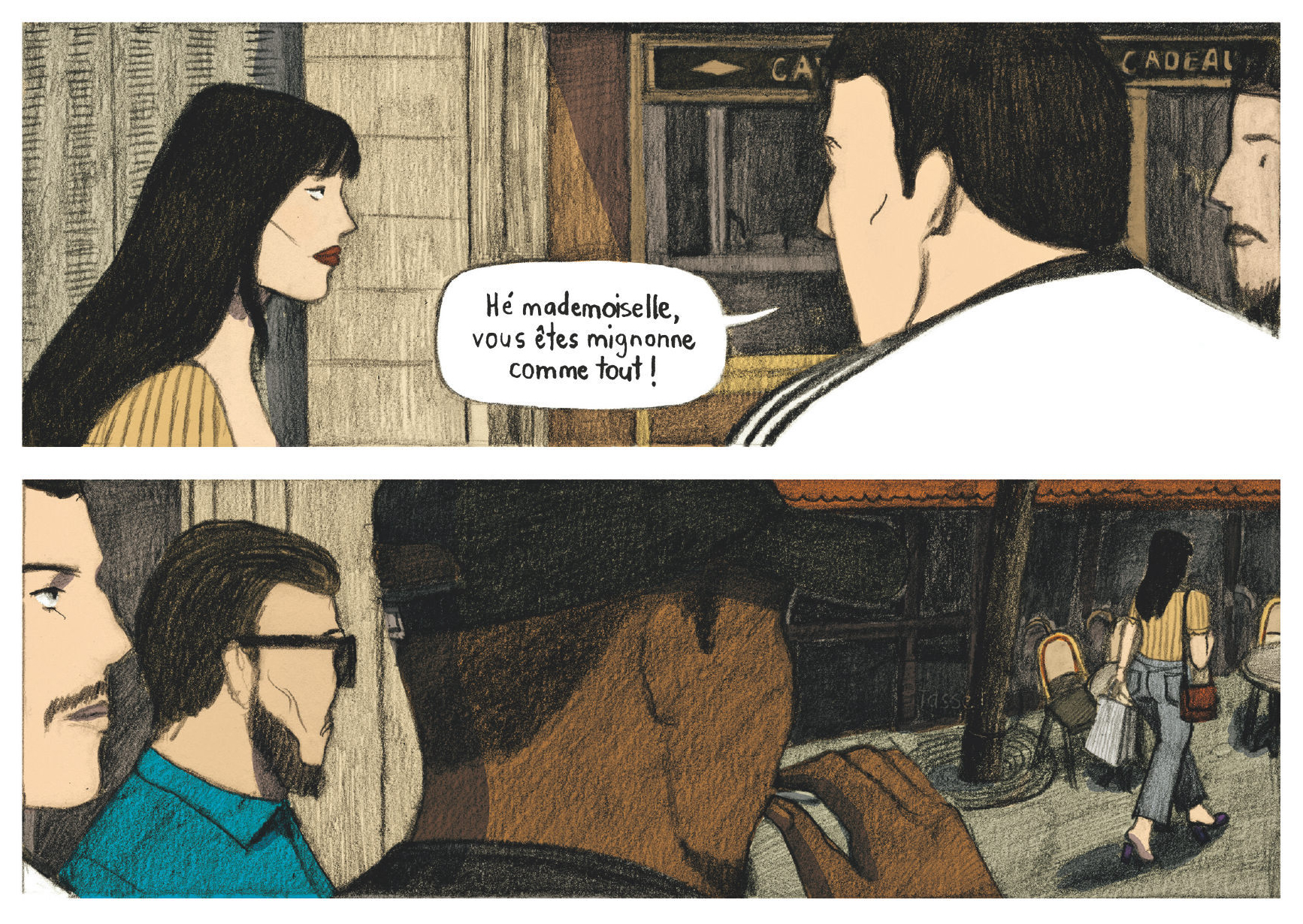 Non, j’ai gardé la même technique que pour l’album sur Patrick Dewaere. Je dessine toujours d’abord au crayon et puis je rajoute les couleurs de manière numérique. Pour le moment, j’aime surtout dessiner au crayon parce que c’est un outil qui me permet d’insérer plus d’ambiance dans mes planches, notamment grâce aux hachures, mais à l’avenir, je suis prête à tester aussi d’autres techniques. Peut-être qu’un jour je ferai une BD dessinée à l’encre, cela dépendra du projet.