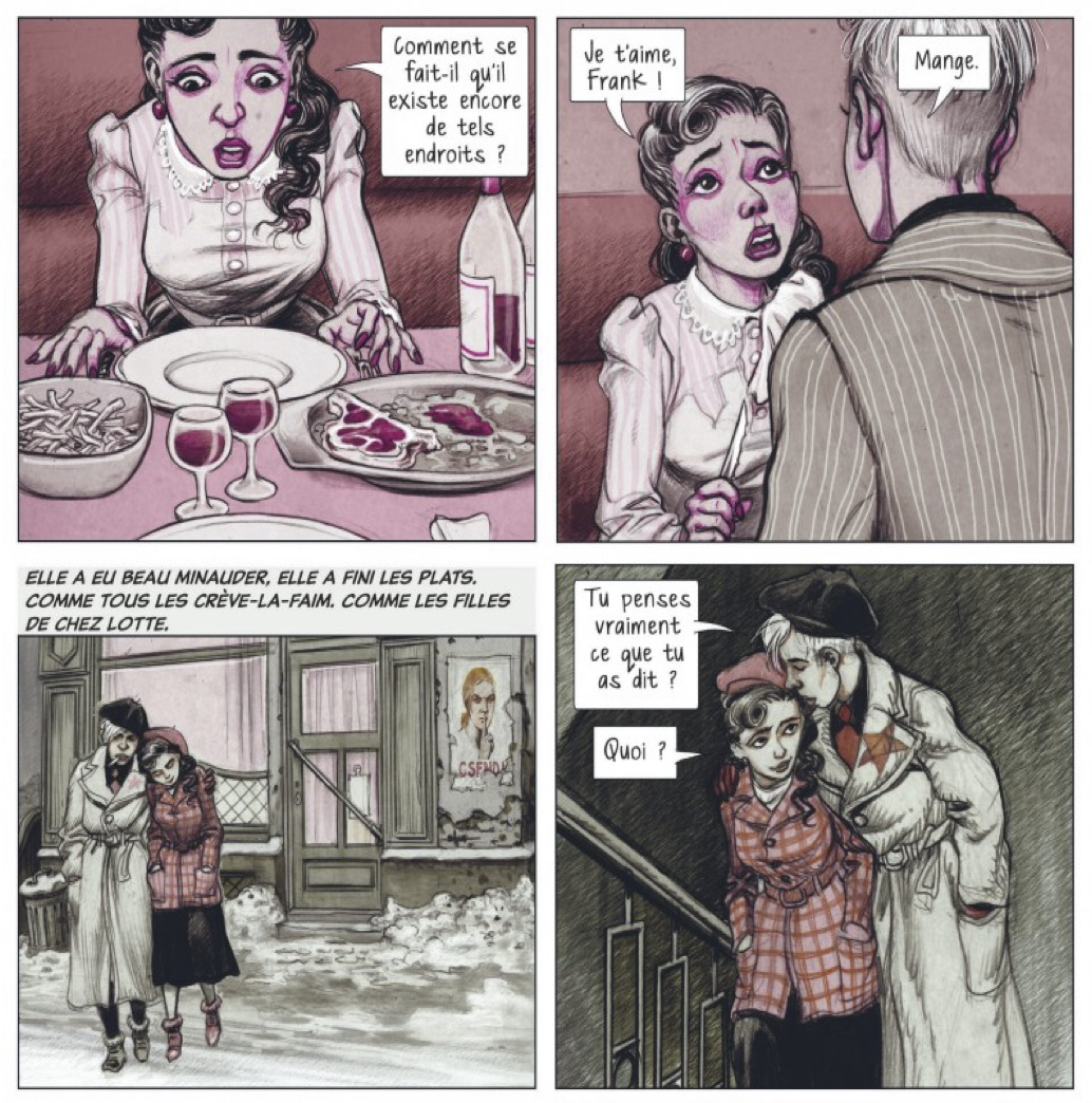Frank est un bad boy qui plaît aux filles. Pour son look, j’ai donc pensé aux zazous, qui étaient des sortes de rebelles pendant la guerre. Il y en avait en France, mais aussi à Hambourg et dans des tas d’autres villes. Ce sont des gens qui faisaient le contraire de ce que les restrictions de l’époque imposaient. Au lieu d’avoir des costumes qui ne coûtaient pas cher, par exemple, ils avaient tendance à doubler les étoffes. J’avais envie que le Frank de mon livre fasse référence à la fois aux zazous et à Tintin. C’est une sorte de Tintin, mais vraiment dark. Ce qui rend ce personnage jouissif, c’est qu’il a un côté beau gosse, alors qu’en réalité, c’est une vraie crapule.