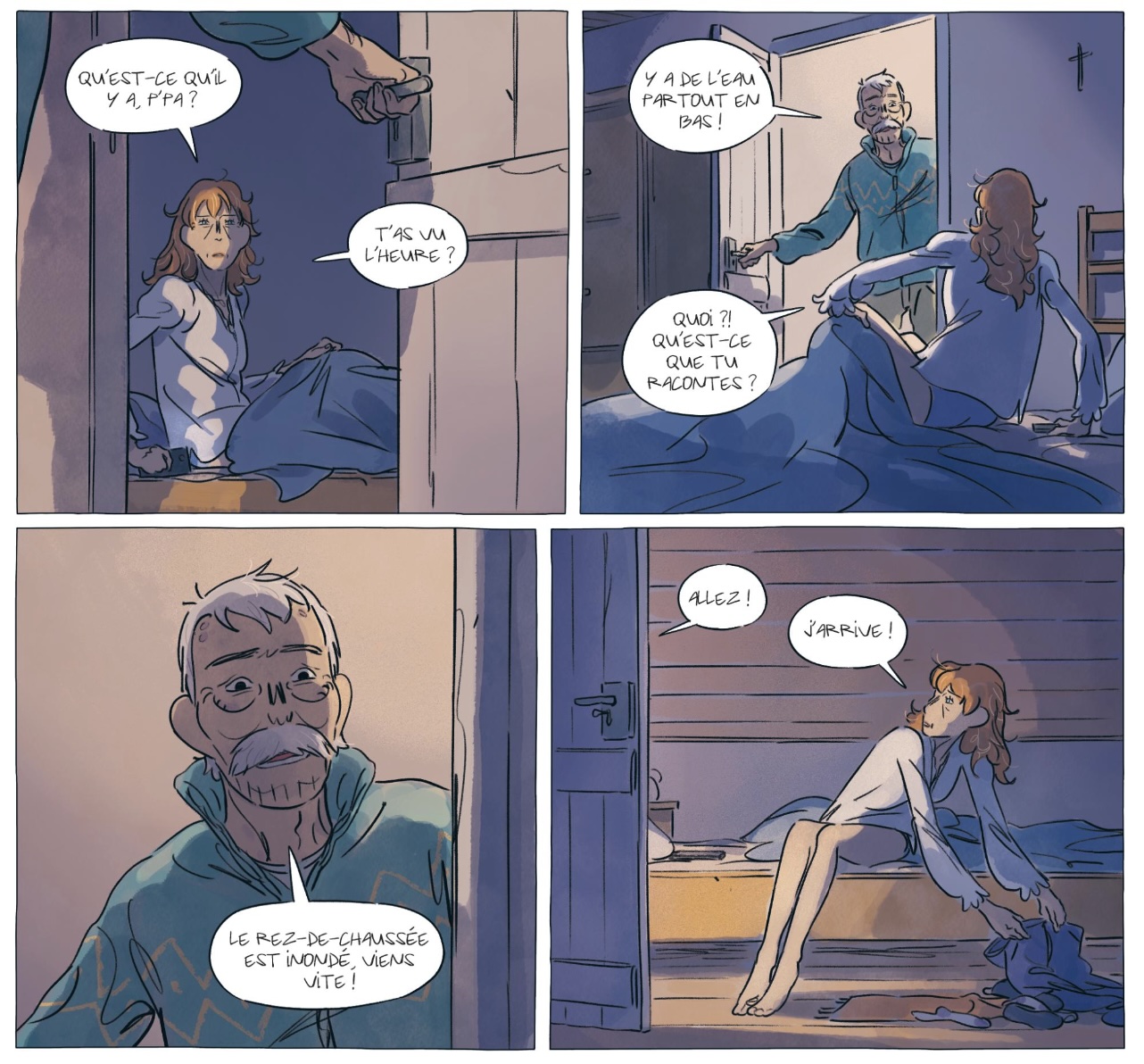 On se souvient tous évidemment des terribles inondations qui ont touché la Wallonie en juillet 2021, particulièrement dans la région liégeoise, lorsque la Vesdre, l’Ourthe et la Meuse sont sorties de leur lit. Le jeune auteur de bande dessinée belge Jean Cremers, qui s’est fait remarquer ces dernières années avec ses romans graphiques « Vague de froid » et « Le grand large », a vécu ces inondations de très près. A l’époque, il s’est en effet retrouvé piégé pendant trois jours avec ses grands-parents dans leur maison, tandis que l’eau ne cessait de monter. En trois heures, il y a eu 1 mètre d’eau dans la maison, puis 1 mètre 80… C’est ce qui fait de « Après l’orage » une BD avec beaucoup d’éléments personnels, dans laquelle Jean Cremers a notamment représenté la rue et la maison de ses grands-parents. Mais ce n’est pas une histoire autobiographique. C’est bel et bien une fiction, très réussie et très humaine, dans laquelle l’auteur s’appuie sur le huis clos créé par les inondations pour aborder toute une série de thèmes essentiels: le couple, la maladie, la violence conjugale, les choix qu’on fait (ou qu’on ne fait pas). Tout cela est traité avec beaucoup de nuances et de délicatesse, même si certaines pages de la BD sont très dures. Au niveau du graphisme, Jean Cremers garde son style simple et dépouillé, dans lequel il soigne surtout les attitudes et les expressions de ses personnages, notamment ce moment très fort où Hélène observe son corps meurtri dans le miroir. Les couleurs, les ambiances, les cadrages achèvent de faire de ce roman graphique un livre puissant et touchant, à lire absolument.