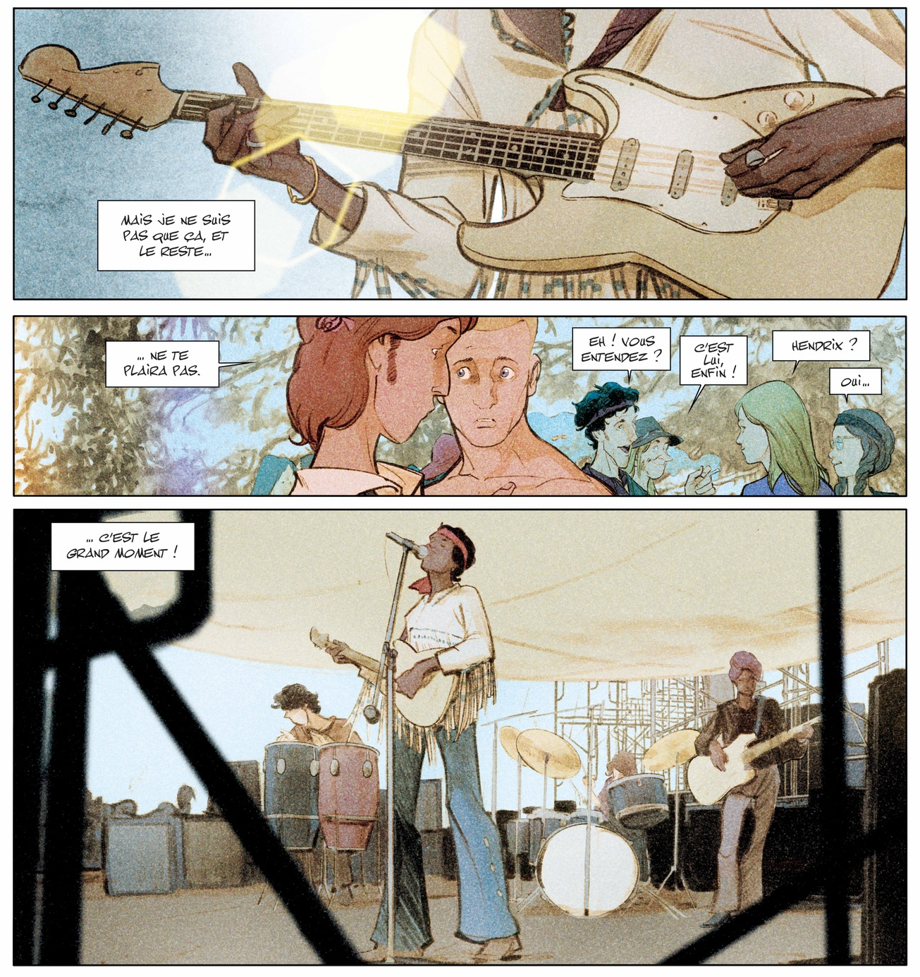 Pour les fans de rock, Woodstock est un nom absolument mythique. Durant quatre jours et quatre nuits, c’est là que les plus grands noms de la musique de l’époque se sont retrouvés en août 1969 pour un concert qui s’est imposé comme la bande son de toute une génération. Des artistes comme Santana, Jimi Hendrix, Joan Baez, Janis Joplin, The Who, Joe Cocker, Crosby, Stills, Nash & Young, Canned Heat, ou encore Jefferson Airplane, resteront à jamais associés au festival de Woodstock, considéré aujourd’hui comme le point culminant de la période du « flower power ». Et pourtant, comme le soulignent Kid Toussaint et José Luis Munuera dans leur BD « Le concert du siècle », rien ne s’est passé comme prévu pendant cet événement. En raison de la foule immense et des embouteillages monstres, il a notamment fallu utiliser un hélicoptère pour amener les artistes jusqu’à la scène, tandis que la boue et la pluie ont rendu le site particulièrement inconfortable pour les festivaliers. Mais ceux-ci ont fait preuve de solidarité, comme le montre bien la BD, en partageant couvertures, nourriture et abris de fortune. La force de cette BD est qu’elle s’appuie sur une documentation solide pour relater ce qui s’est passé à Woodstock, mais sans perdre de vue l’importance de raconter une bonne histoire, avec une jolie galerie de personnages attachants et des rebondissements inattendus. Kid Toussaint utilise habilement le festival de Woodstock comme décor, mais il n’en fait pas le sujet principal de son récit. Dans « Woodstock 69 », il raconte avant tout l’histoire d’Ulysse et Leslie, tandis que Jimi Hendrix ou Joan Baez ne sont pour lui que des personnages secondaires. C’est sans doute ce qui fait en sorte qu’on se laisse happer par cette histoire, qui garde la bonne cadence de la première à la dernière page, avec aussi une solide dose d’humour. Et puis, comment ne pas s’extasier devant les dessins de José Luis Munuera et les couleurs de Sedyas, qui collent parfaitement à cette histoire? Le dessinateur espagnol, qui souhaitait « raconter une histoire sur la génération de ses parents lorsqu’ils avaient l’âge de ses filles », restitue à merveille l’ambiance euphorique et fraternelle de Woodstock. Et surtout, il nous donne envie d’aller revoir les images et de réécouter les chansons de l’époque.