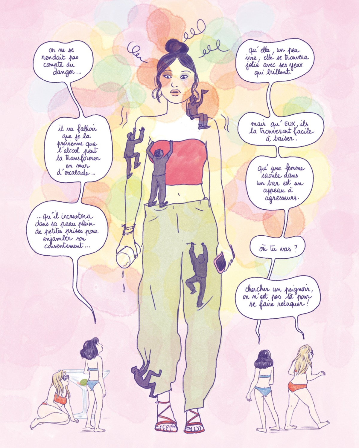 Voilà, c’est vraiment ça. Pour chaque scène, il fallait que j’invente une scénographie. Parfois, c’est très classique, la mère et la fille qui discutent ensemble, par exemple, mais d’autres fois, ce sont des choses plus fofolles. La scène que j’ai préférée dessiner, c’est celle sur l’alcool. Bien sûr, c’est un sujet grave, mais j’ai essayé de le dédramatiser en représentant les protagonistes en pleine séance de spa alcoolique, en train de se baigner dans des cocktails géants. Je me suis beaucoup amusée avec ça.